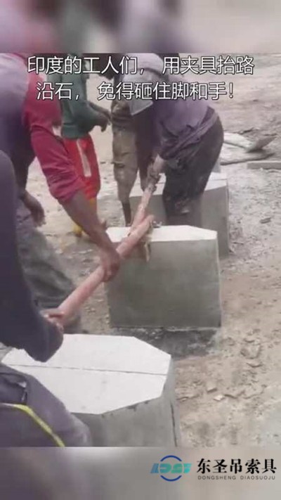 石材吊夾廠家介紹印度自制吊夾。如圖所示,印度工人使用自制手抬夾具吊夾路沿石。